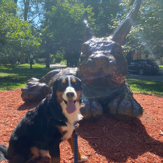 From about March to November, this is one of our favorite times to take a quick walk around the block. We get in a nice routine where Bert and Ernie get to greet some of the neighborhood kids as they wait for the school bus and we all get to stretch our legs before the work day begins. These walks are a lot less likely to happen in December, January, and February when it is cold and dark in the mornings. One of our favorite spots to walk is along Minnehaha Creek; we like visiting the big bunny sculpture along this route. The neighbors in the area dress up the bunny depending on the time of year!